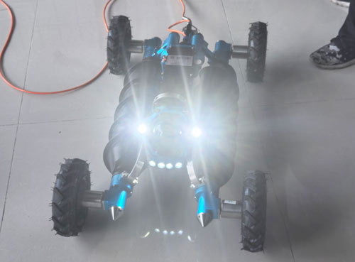 這款由武漢世隆科技自主研發(fā)的機(jī)器人,最大特點(diǎn)是具備"水陸兩棲"的全地形適應(yīng)能力。其采用螺旋式與輪式雙推進(jìn)系統(tǒng)設(shè)計(jì),可根據(jù)作業(yè)環(huán)境自由切換推進(jìn)模式——在堤岸等平地場(chǎng)景時(shí),輪組驅(qū)動(dòng)能實(shí)現(xiàn)快速機(jī)動(dòng);進(jìn)入水面、泥沼或狹窄管渠時(shí),輪組可自動(dòng)折疊,通過(guò)螺旋式推進(jìn)提升浮力與推力,確保在復(fù)雜環(huán)境中平穩(wěn)作業(yè)。這一特性恰好適配汾河流域"堤岸-河道-管網(wǎng)"的多元監(jiān)管場(chǎng)景,填補(bǔ)了傳統(tǒng)設(shè)備的應(yīng)用空白。