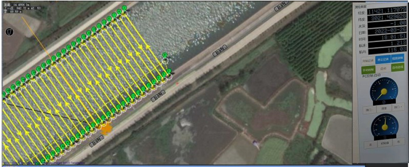 無人船測量相比有人船測量在航行的軌跡上有著絕對的優(yōu)勢,無人船由于內部有自動調整推進器,切流方向工作時會自動調整推進器方向,使得推進力產生水流方向的速度分量,即便在流速與流向不斷變化的復雜工作環(huán)境中,自動控制系統(tǒng)也會保證無人船在自動模式下按照計劃線航行,獲取的數據即美觀又準確。